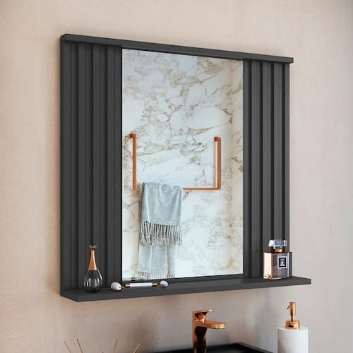 Que tal o Espelho de Banheiro Luiza? Uma forma charmosa de aprimorar a decoração do seu banheiro é apostar no Espelho Luiza. Além de ter a clássica função de te ajudar nos looks do dia ou até nos momentos de autocuidado, ele também tem visual moderno e sofisticado, graças ao MDP com acabamento ripado. Além de tudo, a peça ainda tem uma prateleira para pequenos itens do dia a dia, como perfume e outros cosméticos. Daí é só adquirir um bom gabinete e uma cuba que estará pronto seu banheiro dos sonhos :) Marca: Modern