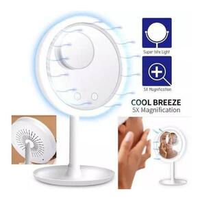 - Material: Polipropileno e Componentes Eletrônicos. - Alimentação: por cabo USB ou com 4 Pilhas AA 1.5v Não incluso . - Voltagem: 5v. - Quantidade de LED: 40 LED. - A Função Ventilador possui 3 Velocidades. - Possui 2 tipos de espelho, o maior que tem a visão normal e o menor que tem um aumento de 5x para te ajudar naquele detalhe. - Espelho com Botão Touch Screen na parte frontal para Ligar e Desligar as funções. - Possui base removível - O espelho possui um espaço na base para você deixar os seus produtos de maquiagem acolhidos enquanto os usam.