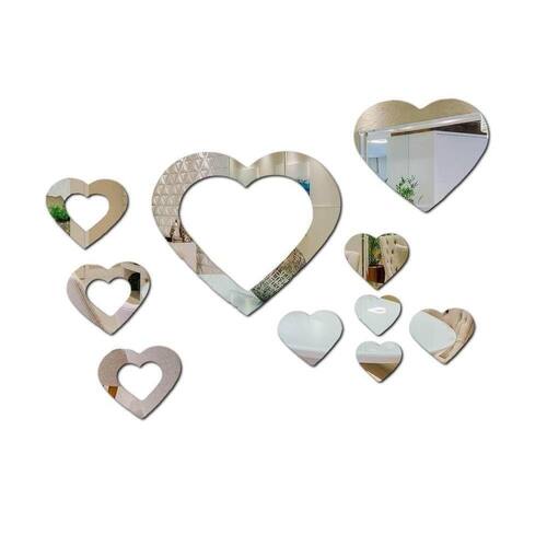 Espelho Decorativo De Coração Vazado 10 Peças Espelho decorativo de coração com 10 peças. Material: acrílico. Espessura: 2mm. Tamanho: 01 x coração de 21 cm. 01 x coração de 16cm. 03 x corações de 9 cm. 03 x corações de 7 cm. 02 x corações de 5 cm. Obs: Acompanha fita dupla face instalada Acompanha película protetora no lado espelhado. Retirar após a instalação.