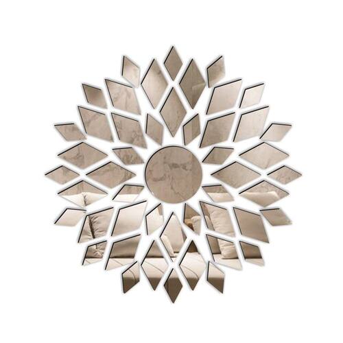 Espelho Decorativo em Acrílico Mandala 100x100 cm 38194 Cor da moldura: Prateado Cod: 38194Kit composto por:49 peçasGabarito em papel para aplicação do modelo sugerido.As peças já vão com a fita dupla face para aplicação.Devido ao gabarito fica prático e fácil fazer a montagemO gabarito vai com o modelo de sugestão.Mas a criatividade é sua para usar e abusar. Medidas sugestão Comprimento:100,00 cmLargura: 100,00 cmMaterial Espelho em Acrílico com 2mm de espessura, com reflexo idêntico ao espelho de vidro. Mas por ser flexível pode ocorrer pequenas distorções de imagem de acorda com a superfície de instalação. Portanto quanto mais lisa a superfície melhor a imagem da peça. Aplicaçãoo espelho de acrílico é um material resistente, não cortante e muito mais leve que um espelho de vidro, portanto são indicados para decorar o ambiente e ao mesmo tempo prezando pela segurança.Aplicar em paredes lisa e limpas. Residencial: Paredes de sala, quartos, quartos de crianças, moveis, etc.Comercial: Paredes de lojas, hall de condomínios, escolas, academias, bares, lanchonetes, etc. ObservaçãoO espelho de acrílico possui uma película de proteção para evitar eventuais danos no manuseio e transporte. Essa película normalmente e fosca e com riscos. Após instalada a peça é só remover a película para o brilho do espelho aparecer. Limpezautilizar um pano levemente umedecido como uma flanela macia.Se houver necessidade utilizar lustra móveis, para limpeza e brilho.AtençãoJamais utilizar álcool ou materiais de limpeza como Veja e similares.Isso danifica o espelho.