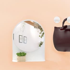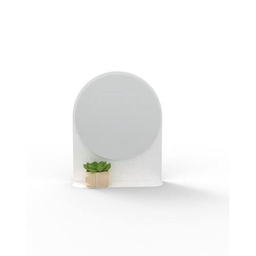Espelho Funcional Cimbre Branco 40 cm redondo Os modelos Cimbre possuem moldura de aço com prateleira contínua. O espelho redondo de 40 cm aparenta flutuar sobre a moldura, com uma prática prateleira Multifuncional, complementa diversos ambientes como Halls de entrada, lavabos, dormitórios e mesmo salas.