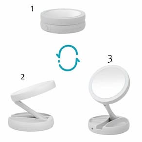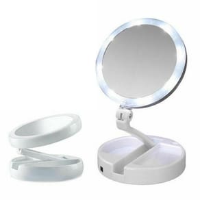 Espelho Led Duplo Com Lente De Aumento Articulado Para Maquiagem Redondo - Espelho dobravel com led para maquiagem / Dupla face / aumenta 10x Este espelho, é feito para você mulher que mesmo na correria cotidiana, sempre arruma um tempinho para retocar a maquiagem ou arrumar o cabelo. Por ser Dobrável, leve e compacto, ocupa pouco espaço, sendo ideal para guardar na bolsa, na mala de viagem e até mesmo em casa e estende-se para um máximo de 13 De altura. Além de ter um design super elegante, este espelho de maquiagem com dupla face, é iluminado com leds, sendo muito prático, basta pressionar um botão na Parte inferior do suporte, que ligará as luzes led, as luzes de led são super brilhantes em ambos os lados para iluminação perfeita da imagem. O mesmo gira e se Transforma em um poderoso espelho de ampliação que aumenta em 10x a imagem. Informações técnicas Modelo: espelho led 10x dupla face Material do suporte: plástico Vidro: livre de distorção Leds: são classificados por 30.000 horas Espelho de aumento: 10x Construído em organizador para acessórios Requerimentos: 4 pilhas aa não incluído Medidas do produto: Espelho aberto: -altura: 34cm -largura: 16cm -comprimento: 18cm -apenas o espelho: 13x13cm largura x comprimento Espelho fechado/dobrado: - largura: 16cm - altura: 5cm - comprimento: 18cm Peso: 338g 3 meses de garantia contra defeito de fabricação Itens inclusos 1 - espelho dobrável com led e 360º 1 - manual de instruções 1 - cabo para ligar no usb