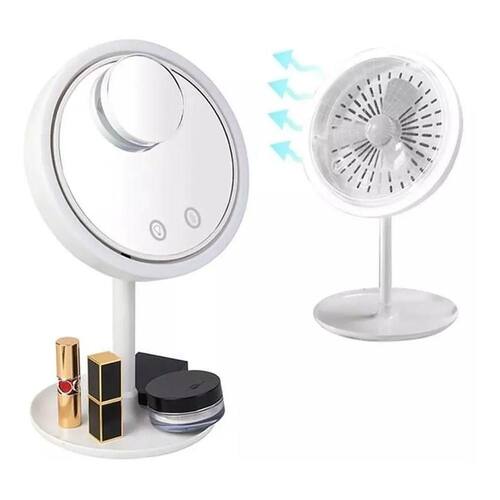 - Material: Polipropileno e Componentes Eletrônicos. - Alimentação: por cabo USB ou com 4 Pilhas AA 1.5v Não incluso . - Voltagem: 5v. - Quantidade de LED: 40 LED. - A Função Ventilador possui 3 Velocidades. - Possui 2 tipos de espelho, o maior que tem a visão normal e o menor que tem um aumento de 5x para te ajudar naquele detalhe. - Espelho com Botão Touch Screen na parte frontal para Ligar e Desligar as funções. - Possui base removível - O espelho possui um espaço na base para você deixar os seus produtos de maquiagem acolhidos enquanto os usam.