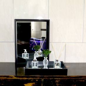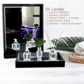 INCLUSO: - 02 Frascos de vidro 100ml* - 01 Válvula para saboneteira Prata - 01 Tampa para difusor Prata - 03 Varetas - 01 Vasinho decorativo + Ramo de folhagem - 01 Bandeja de Espelho Reforçada 23cmx33cm - 01 Espelho Reforçado de Parede 33x43cm ................................................................................