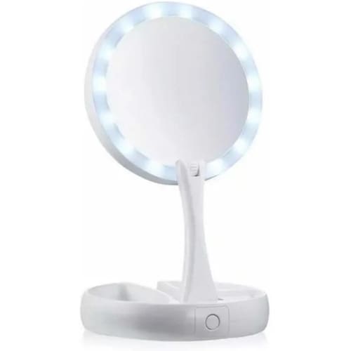 My foldaway mirror é um espelho de vaidade iluminado e de dois lados. Tem uma poderosa ampliação de 10x. Dobra e gira para fácil utilização e armazenamento. O led super brilhante acende-se em ambos os lados para iluminação perfeita da imagem. É feito de vidro isento de distorção. Este espelho 1x gira para um poderoso espelho de ampliação de 10x. Possui um organizador embutido para acessórios. É leve e compacto para viagens. O espelho é nítido, limpo e livre de distorção.