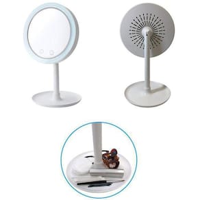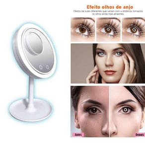 Características do Produto - Material: Polipropileno e Componentes Eletrônicos. - Alimentação: Liga por USB ou com 4 Pilhas AA 1.5v Não acompanha . - Voltagem: 5v. - Quantidade de Led: 40 Led. - A Função Ventilador possui 3 Velocidades. - Possui 2 tipos de espelho, o maior que tem a visão normal e o menor que tem um aumento de 5x para te ajudar naquele detalhe. - Espelho com 40 Luzes de Led Frontal. - Espelho com Botão Touch Screen na parte frontal para Ligar e Desligar as funções. - Possui base removível - O espelho possui um espaço na base para você deixar os seus produtos de maquiagem acolhidos enquanto os usam.