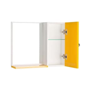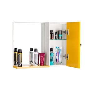 Espelho para Banheiro com Armário Amarelo. Já vem montado, pronto para colocar na parede. É só abrir a caixa e instalar em seu banheiro. Acompanha 2 parafusos com buchas para instalar na parede. Obs: a colocação dele na parede é por conta do cliente, mas é bem fácil de fazer, basta uma furadeira, régua e lápis para marcar o local de instalação. Basta colocar os dois parafusos na parede, depois encaixar o armário com espelho neles (tem 2 suportes metálicos atrás do armário, para encaixar nos parafusos). Armário para Banheiro com Espelho na cor Amarelo é ideal para organizar vários itens. Possui prateleira interna em vidro, armário com porta e amplo espelho. É a escolha perfeita para seu banheiro. Material: MDP 15mm Cor: Amarelo e Branco Altura total: 46cm Largura total: 58cm Profundidade total: 12,5cm Medidas do Espelho: 33cm x 42,5cm Instalação: a montagem e instalação do produto na parede são por conta do cliente Limpeza e conservação: recomenda-se a limpeza com pano úmido, não utilizar produtos abrasivos ou químicos Obs: Este anuncio inclui somente o armário com espelho, todos os itens de decoração das fotos não estão inclusos.