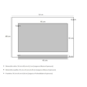 Espelho para banheiro com prateleira 50cm preto os nossos espelhos são ideais para banheiros e lavabos trazendo um toque especial no projeto de decoração e proporcionando um design moderno e arrojado no ambiente. Além da elegância, sofisticação e praticidade tem a qualidade e a durabilidade indiscutível, pois todos os itens podem molhar que não irá danificar, os vidros são pintados com tinta de alta performance, o que lhe garante a permanência da cor. Os suportes da prateleira e as tampas dos parafusos são de inox, mais uma garantia de excelência da qualidade desse produto. Itens inclusos: - vidro temperado colorido: 50 cm x 40 cm largura x altura - espelho: 41 cm x 31 cm x largura x altura - prateleira: 41 cm x 8 cm largura x profundidade - kit parafusos completo para instalação