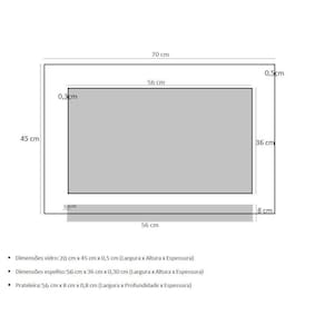 Espelho para banheiro com prateleira 70cm preto os nossos espelhos são ideais para banheiros e lavabos trazendo um toque especial no projeto de decoração e proporcionando um design moderno e arrojado no ambiente. Além da elegância, sofisticação e praticidade tem a qualidade e a durabilidade indiscutível, pois todos os itens podem molhar que não irá danificar, os vidros são pintados com tinta de alta performance, o que lhe garante a permanência da cor. Os suportes da prateleira e as tampas dos parafusos são de inox, mais uma garantia de excelência da qualidade desse produto. Itens inclusos: - vidro temperado colorido: 70 cm x 45 cm largura x altura - espelho: 56 cm x 36 cm x largura x altura - prateleira: 56 cm x 8 cm largura x profundidade - kit parafusos completo para instalação