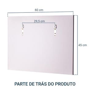 Suas medidas totais são: 60cm de Largura x 45cm de Altura x 13cm de Profundidade. O espelho mede: 33cm de Largura x 42,5cm. Peso: 3kg.