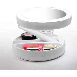 Além de ter um design super elegante, este espelho de maquiagem com dupla face, é iluminado com leds, sendo muito prático, basta pressionar um botão na parte inferior do suporte, que ligará as luzes LED, as luzes de LED são super brilhantes em ambos os lados para iluminação perfeita da imagem. O mesmo gira e se transforma em um poderoso espelho de ampliação que aumenta em 10x a imagem.