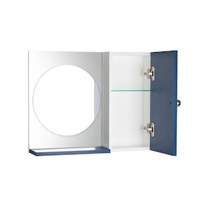 Espelho Redondo para Banheiro com Armário Azul. Já vem montado, pronto para colocar na parede. É só abrir a caixa e instalar em seu banheiro. Acompanha 2 parafusos com buchas para instalar na parede. Obs: a colocação dele na parede é por conta do cliente, mas é bem fácil de fazer, basta uma furadeira, régua e lápis para marcar o local de instalação. Basta colocar os dois parafusos na parede, depois encaixar o armário com espelho neles (tem 2 suportes metálicos atrás do armário, para encaixar nos parafusos). Armário para Banheiro com Espelho na cor Branca é ideal para organizar vários itens. Possui prateleira interna em vidro, armário com porta e amplo espelho. É a escolha perfeita para seu banheiro. Material: MDP 15mm Cor: Branco Altura total: 46cm Largura total: 58cm Profundidade total: 12,5cm Instalação: a montagem e instalação do produto na parede são por conta do cliente Limpeza e conservação: recomenda-se a limpeza com pano úmido, não utilizar produtos abrasivos ou químicos Obs: Este anuncio inclui somente o armário com espelho, todos os itens de decoração das fotos não estão inclusos.