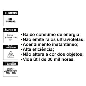Iluminação eficiente: fluxo luminoso de 310 lúmens com baixo consumo (5W).