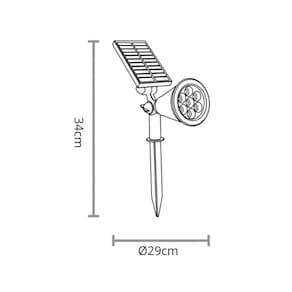 Energia solar Potência: 3W Temperatura de cor: 6500K Fluxo luminoso: mínimo 90lm e máximo 150Lm Cor do corpo: Preto Simples instalação Bateria AAA Li-lon 3,7v 2000mAh Produzido em ABS + Policarbonato Vida útil: 10.000 horas Para uso externo (IP 65) Foco direcionável Dimensões: Ø290 x 340mm
