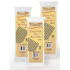 Descrição e Características: Espetos roliços fabricados em bambu asiático. Produto altamente sustentável e de baixo impacto ecológico. Especificações, quantidade na embalagem e código do produto: