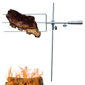 Espeto triplo com apoio para fazer um delicioso churrasco no fogo de chão; Com regulagem de altura e posição do espeto com relação ao fogo; Reforçado para o preparo de peças inteiras, ideal para todos os tipos de churrasqueiras; Ideal para o preparo de carnes, legumes, frutas e outras opções de alimentos que vão ao fogo.