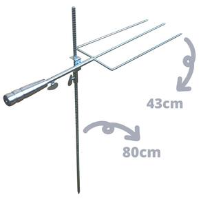 Você recebe: 1- Espeto triplo em aço com cabo de alumínio. 1- Haste de sustentação para posicionamento do espeto. Medidas: - Comprimento total: 75 cm - Comprimento cabo: 12 cm - Comprimento do espeto: 43 cm - Área útil: 40 cm - Espaço entre as hastes: 15 a 16 cm aproximadamente