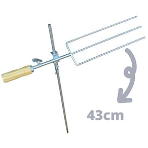 Você recebe: 1- Espeto triplo em aço 1- Haste de sustentação para posicionamento do espeto. Medidas: - Comprimento total: 75 cm - Comprimento cabo: 12 cm - Comprimento do espeto: 43 cm - Área útil: 40 cm - Espaço entre as hastes: 15 a 16 cm aproximadamente