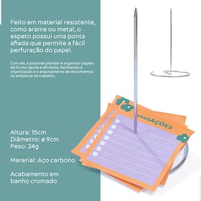 Organização: Mantenha seus papéis organizados e acessíveis. Praticidade: Fácil de usar, basta fixar o espeto na superfície desejada. Versatilidade: Pode ser utilizado em diversos ambientes e situações. Aplicações: