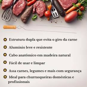 Espeto Duplo Alumínio 45cm com Cabo de Madeira Churrasqueira Dragão O Espeto Duplo de Alumínio 45cm com cabo de madeira Churrasqueira Dragão é ideal para churrascos práticos e bem assados. Com estrutura resistente, leve e de fácil manuseio, ele evita que os alimentos girem ao assar, garantindo cozimento uniforme. O cabo anatômico em madeira proporciona conforto e segurança térmica. Perfeito para carnes, legumes e muito mais. Um item essencial para todo churrasqueiro de verdade Características do Produto Tipo: Espeto duplo Material das hastes: Alumínio resistente Comprimento total: 45 cm Cabo: Madeira natural com acabamento anatômico Estrutura: Hastes duplas para maior estabilidade dos alimentos Indicação: Ideal para churrasqueiras domésticas e profissionais Seu design duplo mantém as carnes firmes e evita o giro indesejado ao assar, proporcionando cozimento uniforme. A leveza do alumínio com a pegada segura da madeira tornam esse espeto um item essencial para todo churrasqueiro Benefícios Evita que os alimentos girem enquanto assam Leve e resistente: alumínio que facilita o manuseio Cabo de madeira confortável e térmico Ideal para diversos cortes: , frango, picanha e legumes Fácil de limpar e guardar Perfeito para uso doméstico e Detalhes Técnicos Material das Hastes: Alumínio polido Comprimento Total: 45 cm Espessura dos fios: Aproximadamente 3 mm cada Tipo de Espeto: Duplo reto Distância entre as hastes: Ideal para fixação firme dos alimentos Cabo: Madeira com acabamento em verniz protetor Peso Aproximado: Super leve, fácil de manusear Espeto Churrasco Leve seu churrasco a outro nível com o Espeto Duplo 45cm Praticidade, segurança e sabor em cada assada. Garanta já o seu e vire o mestre da grelha Marca: Não Informado