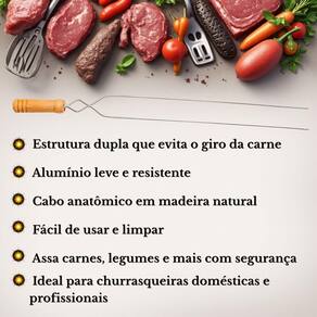 Espeto Duplo Alumínio 55cm com Cabo de Madeira Churrasqueira Dragão O Espeto Duplo de Alumínio 55cm com cabo de madeira Churrasqueira Dragão é ideal para churrascos práticos e bem assados. Com estrutura resistente, leve e de fácil manuseio, ele evita que os alimentos girem ao assar, garantindo cozimento uniforme. O cabo anatômico em madeira proporciona conforto e segurança térmica. Perfeito para carnes, legumes e muito mais. Um item essencial para todo churrasqueiro de verdade Características do Produto -tipo: Espeto duplo -material das hastes: Alumínio resistente -comprimento total: 55 cm -cabo: Madeira natural com acabamento anatômico -estrutura: Hastes duplas para maior estabilidade dos alimentos -indicação: Ideal para churrasqueiras domésticas e profissionais Seu design duplo mantém as carnes firmes e evita o giro indesejado ao assar, proporcionando cozimento uniforme. A leveza do alumínio com a pegada segura da madeira tornam esse espeto um item essencial para todo churrasqueiro Benefícios -evita que os alimentos girem enquanto assam -leve e resistente: alumínio que facilita o manuseio -cabo de madeira confortável e térmico -ideal para diversos cortes: , frango, picanha e legumes -fácil de limpar e guardar -perfeito para uso doméstico e Detalhes Técnicos -material das Hastes: Alumínio polido -comprimento Total: 55 cm -espessura dos fios: Aproximadamente 3 mm cada -tipo de Espeto: Duplo reto -distância entre as hastes: Ideal para fixação firme dos alimentos -cabo: Madeira com acabamento em verniz protetor -peso Aproximado: Super leve, fácil de manusear Espeto Churrasco Leve seu churrasco a outro nível com o Espeto Duplo 55cm Praticidade, segurança e sabor em cada assada. Garanta já o seu e vire o mestre da grelha Marca: Não Informado