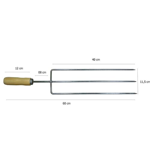 Você recebe: 1- Espeto triplo em aço 1- Haste de sustentação para posicionamento do espeto. Medidas: - Comprimento total: 69 cm - Comprimento cabo: 12 cm - Comprimento do espeto: 40 cm - Área útil: 38 cm - Espaço entre as hastes: 15 a 16 cm aproximadamente
