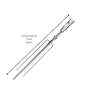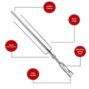 DESIGN E ESTRUTURA: - Lâmina e grafo de inox; - Cabo térmico; - Espetar carnes, coração e asa de frango; - Ideal para o seguintes modelo de churrasqueiras TITAN: AGE 04/06/08/15 Espetos - Prime Suprema 04/06 Espetos.