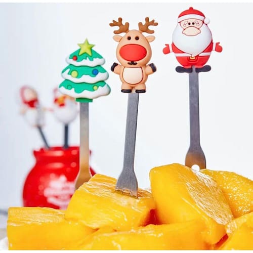 Esses garfos realmente destacam sua mesa de Natal. Feito de aço inoxidável, leve, durável e com acabamento perfeito. A extremidade é feita de silicone. Quando os garfos não estão em uso, podem ser colocados em um pote cerâmico vermelho que irá alegrar a sua ceia.