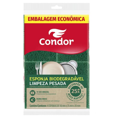 A primeira esponja totalmente biodegradável do Brasil! Possui maior durabilidade e é feita com matérias-primas que se decompõem até 25x mais rápido na natureza. Constribui assim para um futuro mais limpo e consciente e o melhor: mantendo a mesma eficiência de uma esponja comum para lavar louças. Então vamos cuidar do nosso planeta? Garanta agora a mesmo a sua esponja biodegradável Condor! Marca: Não Informado