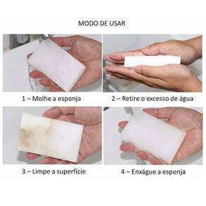 Mergulhe completamente a esponja na água, esprema o excesso de água. nunca utilize com produtos químicos, ou utilize a esponja seca, os melhores resultados são obtidos com a esponja molhada . Esfregar suavemente a esponja em superfícies a serem limpas. lavagens com pressão suave sob a esponja prolongam sua vida útil, aplique mais pressão se as manchas forem mais resistentes . Lavar a esponja regularmente para remover a sujeira presa. Espremer não torcer completamente a esponja e guardá-la seca para a próxima utilização. Reutilize a esponja até que ela tenha um desgaste completo.