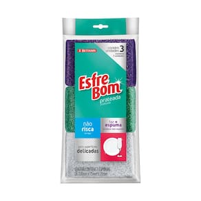 Esponja Prateada Esfrebom 3un Bettanin Esponja revestida com tecido especial. Produz mais espuma e economiza detergente. Não risca! Ideal para superfícies e utensílios delicados. Dimensões: 12 x 7,5 x 2,5 cm Contém: 3 unidades (1 prata, 1 roxo, 1 verde) Composição: esponja de poliuretano revestida de tecido poliéster.