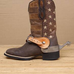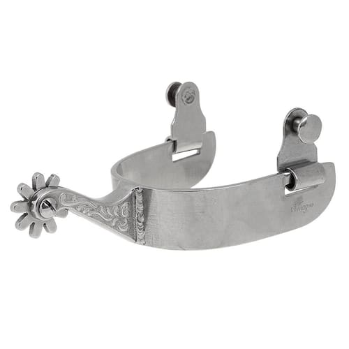 Espora Vinagre modelo Boby fabricada em Aço Inox. Possui cão com detalhes gravados na lateral, roseta de 9 pontas e garfo largo.
