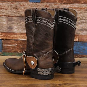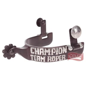 Par de esporas Metalab importadas modelo Santa Fe Team Roping Trophy Spur Level 2, fabricadas em aço de alta resistência, garfo com 1'' (2,54cm) de largura e apliques em prata, cão com 1-1/2'' (3,81cm) de comprimento e rosetas de 8 pontas. Fino acabamento.