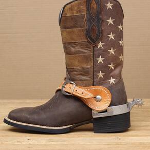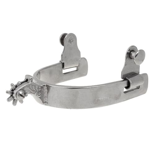Espora Vinagre modelo Topete fabricada em Aço Inox. Possui cão com detalhes gravados na lateral e roseta de 8 pontas.