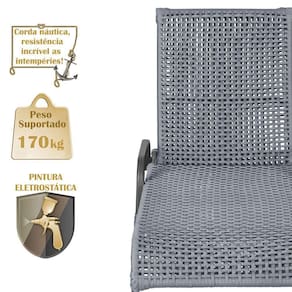 Produto conhecido como: Espreguicadeira reclinavel, Espreguicadeira em aluminio, Espreguicadeira com encosto ajustavel, Espreguicadeira para area externa, Espreguicadeira para piscina, Espreguicadeira resistente ao tempo, Espreguicadeira moderna, Espreguicadeira confortavel, Moveis para area externa, Moveis de aluminio para jardim, Corda nautica para moveis, Espreguicadeira leve e duravel, Design sofisticado para areas externas, Decoracao para varanda e piscina, Espreguicadeira resistente ao sol e chuva