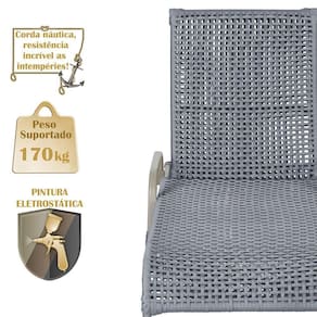 Produto conhecido como: Espreguicadeira reclinavel, Espreguicadeira em aluminio, Espreguicadeira com encosto ajustavel, Espreguicadeira para area externa, Espreguicadeira para piscina, Espreguicadeira resistente ao tempo, Espreguicadeira moderna, Espreguicadeira confortavel, Moveis para area externa, Moveis de aluminio para jardim, Corda nautica para moveis, Espreguicadeira leve e duravel, Design sofisticado para areas externas, Decoracao para varanda e piscina, Espreguicadeira resistente ao sol e chuva