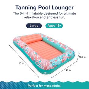 - Grande espreguiçadeira flutuante de piscina: construída com vinil pesado e macio que é confortável, fresco ao toque e feito para durar; mede 71 x 48 x 10,5 polegadas (perfeita para a maioria dos adultos); limite de peso 250 libras; maiores de 15 anos