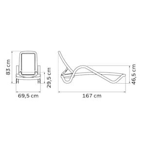 Mais informações - Peso Máximo Recomendável: 140 kg.Material: Resina de polipropileno injetado.Tela: PVC e poliéster com proteção anti-uv.Empilhável até: 10 peças.Inclina até: 4 posições.Com Compartimento e Rodas.Resina Reciclável.