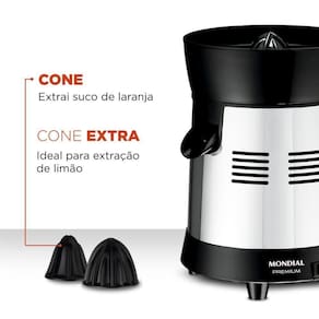 2 CONES PARA EXTRAÇÃO: O cone maior é ideal para preparar sucos de laranja. Acompanha cone extra para frutas menores, como limão.