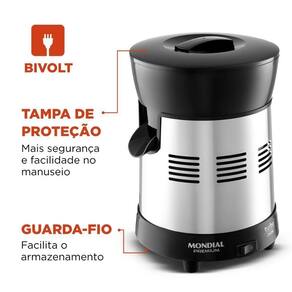 Motor potente de 250W, capacidade de 1 litro, 2 cones para extração (laranja e limão), bivolt, motor blindado com proteção térmica, dupla rotação, copo com peneira, tampa de proteção, guarda-fio.Motor c/ dupla rotação
