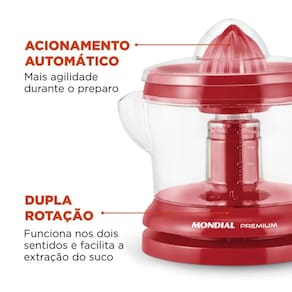 O Espremedor Turbo Citrus Red Premium Mondial faz sucos deliciosos de forma rápida e preserva o frescor da fruta. A capacidade de 1,25 litros produz bastante suco e basta pressionar a fruta no espremedor para acionar o equipamento. Acompanha cone extra para você escolher seu suco favorito, com o máximo rendimento. Conta ainda com dupla rotação e tampa de proteção.