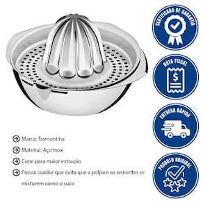 Ele é feito em aço inoxidável, o que garante durabilidade e resistência, possui um cone maior para extração mais fácil, e conta com um coador que impede que a polpa e as sementes misturem-se ao suco, além de uma trava de para uso estável.