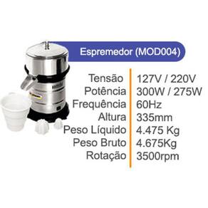 Espremedor Extrator de Suco Industrial Aço Inox O espremedor de frutas industrial Vithory é a solução para praticidade ao extrair sucos e ainda com um acabamento especial, são mais de 10 anos de pura excelência na fabricação de produtos com , qualidade e durabilidade. Ideal para lanchonete e afins. Motor muito forte, o mais potente da categoria, que proporciona o máximo de desempenho. Extrator Suco Industrial resistente e de alta qualidades. O espremedor de suco em aço inox vai acompanhado por: Corpo do motor em aço inox Bica com tampa em alumínio Copo em alumínio Peneira em P.A Duas castanhas em P.A uma para laranja e uma para limão Especificações Técnicas: Modelo: Mod004 Tensão V : Bivolt Frequência HZ : 60 Potência: 300W / 275W Rotação R.P.M : 3.500 Consumo KW/H : 0,246 Altura: CM : 33,5 Peso líquido: KG : 4,47 sem embalagem Manual e certificado de Itens Inclusos: 01 Corpo do motor em aço inox 01 Bica com tampa em alumínio 01 Copo em alumínio 01 Peneira em P.A 02 Castanhas em P.A Manual, certificado de e Marca: Não Informado Ean: 6012503360356