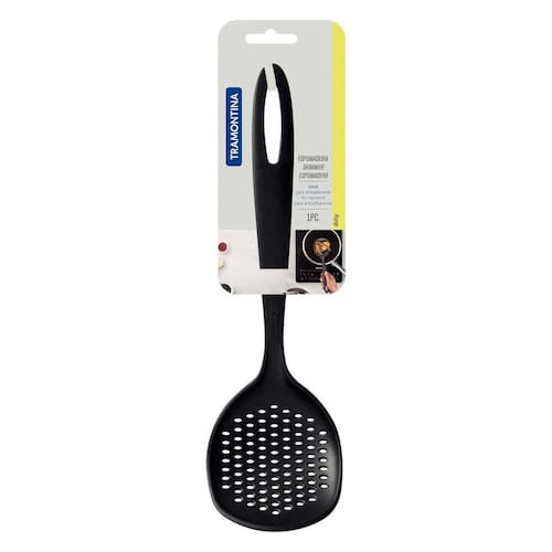 Para preparar e servir alimentos com muita versatilidade e funcionalidade, conte com a Espumadeira Tramontina Ability em Nylon Preto! Eficiente e minimalista, ela é produzida em nylon, pode ser utilizada em temperaturas de até 180° graus e é ideal para ser utilizada em revestimentos antiaderentes e cerâmicos, pois não os danifica. Além disso, ela ainda é fácil de limpar e pode ir à máquina de lavar louças, facilitando sua rotina! Orientações Espumadeira de Nylon que permite uso em temperaturas de até 180 °C. O cabo possui furo passante possibilitando que sejam pendurado na sua cozinha. Utensílio ideal para uso em panelas com revestimentos antiaderentes e cerâmicos, pois não danifica o produto. Pode ir à máquina de lavar louças facilitando seu dia a dia. Observações Antes da primeira utilização, lave bem a peça e seque-a.Para maior durabilidade do produto recomenda-se secar bem antes de guardar, mesmo após lavagem em máquina. Para descarte dos produtos e embalagens siga as orientações de reciclagem vigentes. Características Gerais EAN13 7891112284760 DUN14 17891112284767 NCM 3924.10.00 Peso Líquido 0,0550 kg. Peso Bruto 0,0600 kg. Metragem 0,001899 m³. Dimensões Embalagem (Compr. X Larg. X Alt.) 63x 90x 335 mm. Dimensões Produto (Compr. X Larg. X Alt.) 299x 89x 62 mm. Cor 1 000000 Hexa
