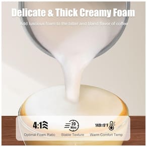O Espumador de Leite Elétrico Ovetedot 4 em 1 oferece versatilidade excepcional! Com capacidade para 400ml, você pode usufruir de espuma densa e quente, espuma leve e quente, espuma gelada e leite quente. Prepare lattes, cappuccinos, matcha ou café gelado com facilidade. Seja seu próprio barista e crie momentos aconchegantes em casa ou no escritório. Com motor de alta eficiência, produz 50% a mais de espuma em apenas 2 minutos. Operação silenciosa, desligamento automático e controle de temperatura garantem segurança e conveniência. Fácil de limpar e produzida com materiais de qualidade!