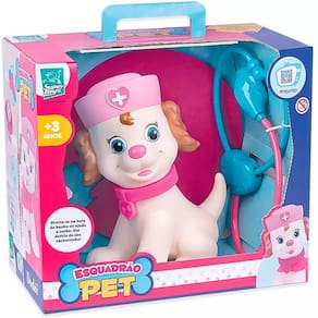 Brincar de veterinário nunca foi tão divertido! Adote seu cachorrinho do Esquadrão Pet. Ele vem com certidão de adoção e adesivos para cuidar do seu cãozinho!