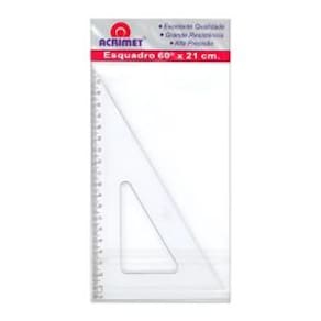 O Esquadro de 60° com 21 cm da Acrimet é feito em poliestireno transparente, com escala gravada por transferência de imagem, que garante medições com alta precisão. Conta com micro ressaltos na face de contato com o papel para reduzir o desgaste das marcações. Produto certificado pelo INMETRO, oferecendo durabilidade e confiabilidade — ideal para uso escolar, técnico ou artístico.