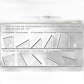 Características : Ângulos dos esquadros : 30/60/90º Tamanho : 16 cm Espessura : 2mm padrão desenho técnico Adicionas : sem chanfro e sem marcações Marca : fenix