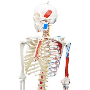 Modelo anatômico de esqueleto humano de 1,70 cm de altura aproximadamente; Confeccionado em PVC, com pintura feita à mão e cores realísticas. Apresenta alta fidelidade anatômica, origens e inserções Musculares do lado esquerdo (Pintadas em Vermelho e Azul); Composto por todos os ossos, montado sob-base com rodas e haste de alumínio; Com o modelo anatômico de esqueleto SD-5001/B podemos identificar do lado esquerdo inserções e origem muscular em cores azul e vermelho respectivamente e é possível identificar os seguintes ossos entre outras estruturas: * Ossos do Crânio (Osso Frontal, Parietal, Nasal, Occipital, Zigomático, Maxilar, Palatino, Temporal, Esfenóide, Etimóide, Vômer, Mandíbula, Dentes extraíveis); * Suturas: Serradas, Escamosas e Planas; Ossos da coluna vertebral: identificação de prolapso entre as vértebras L3/L4); * Vértebras: C1-C7, T1-T12, L1-L5, S1-S5, CO1-CO4; * Discos intervertebrais; * Osso hioide; * Plexos Nervosos, * Ossos do Tórax (Osso esterno, Costelas) * Ossos do Membro superior (Úmero, Ulna, Rádio, Ossos da Mão, Clavícula, Escápula), * Ossos do membro inferior (Fêmur, Patela, Tíbia, Fíbula, Ossos do Pé), * Ossos da Pelve (Ílio, Ísquio, Púbis); * Origens e Inserções dos músculos (Pintados): Cabeça, Pescoço, Tronco, Membro Superior e Membro Inferior.