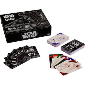 Jogo de cartas UNO Star Wars Technical Schematics da Mattel Games para crianças e adultos com plantas de estações espaciais, naves e dróides - É o clássico jogo de cartas UNO que os jogadores conhecem e adoram, com o tema do universo de Star Wars! - O deck apresenta gráficos com esquemas das naves estelares, estações espaciais e dróides mais icônicos do universo de Star Wars. - A regra especial “That Was One in a Million” fará com que os jogadores joguem cartas na pilha de descarte como se fosse uma porta de escape térmico de no máximo 2 metros de largura! - Não se esqueça, quando os jogadores recebem apenas uma carta, eles devem gritar “UNO!” - É um ótimo presente para colecionadores e fãs de Star Wars para adolescentes, adultos e noites de jogos com 2 a 10 jogadores com 7 anos ou mais!